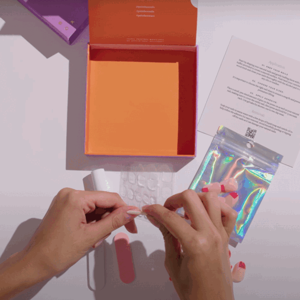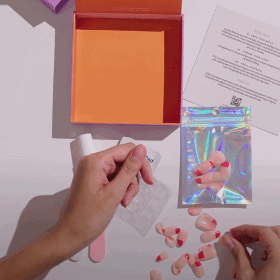 Using the gel tabs, brush-on glue, or a combination of both, apply the press ons one finger at a time. Avoid getting hands wet directly after applying to allow the glue to fully dry. For the full tutorial, click here.