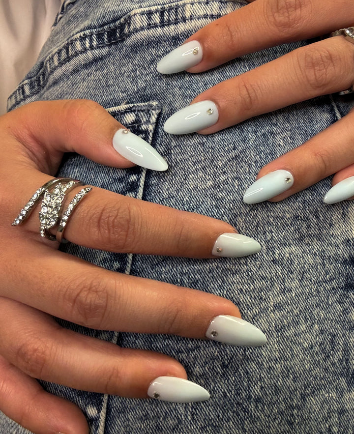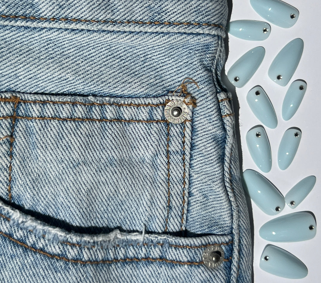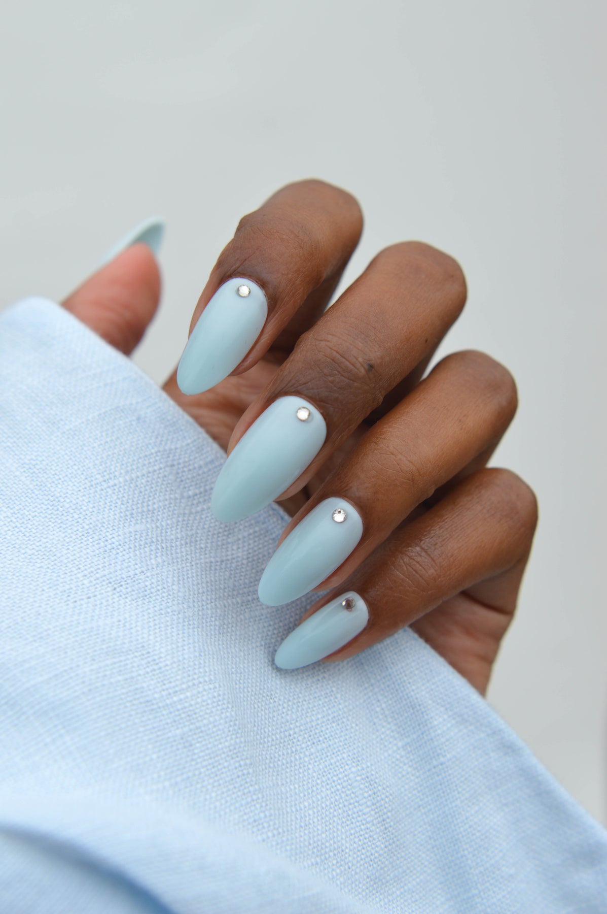 Stone Wash is a long-length press on in the babiest of blues. Inspired by the bedazzled jeans of the 80s, we updated this look with a Paintbox twist: a feminine crystal embellishment sits at the center.